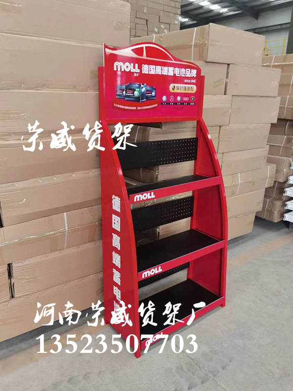 河南荣威货架厂供应汽车用品展示架 新款机油架油品架汽车装饰店货架展示架蓄电池架 我公司作为的蓄电池展示架供应商之一,,价格合 理,深受客户的信赖和好评。下面简单介绍成功食品展示架的特点: 1.充分且合理地利用特有空间。 2.食品展示架完成陈列商品的实用性功能