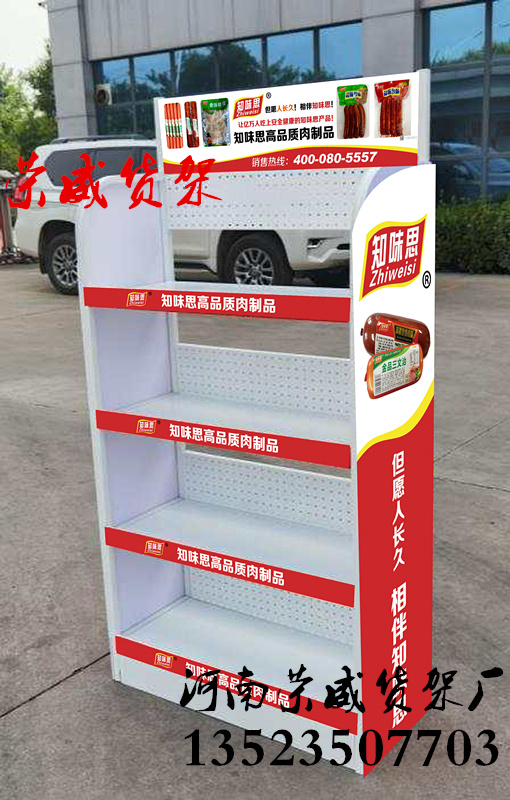 肉制品展示架火腿肠展示架厂家河南荣威货架厂是专业定做商品促销展示架,火腿肠展示架,香肠展示架可以定做货架的外型,及促销货架的画面及LOGO画面